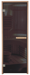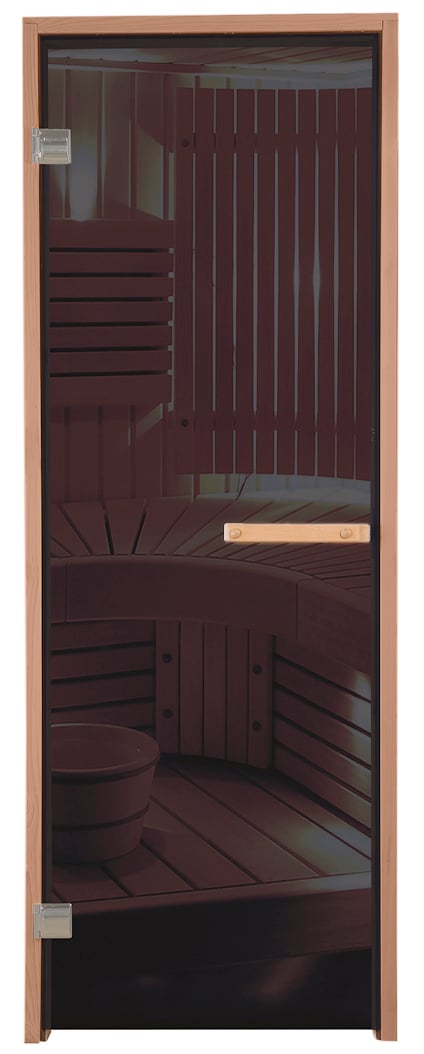 Elegant bastudörr i gråtonat glas. En glasdörr ger extra ljus och framhäver både bastuns material och ger en känsla av rymd. Exactas glasdörr är tillverkad av reptåligt 8 mm härdat säkerhetsglas, och finns i modulstorlek från 6x19 till 10x21. Dörrpaketets hängning är vändbart, och kommer med ett ergonomiskt handtag i björk med rullås och gångjärn i borstat stål. Karmen är tillverkad i av högkvalitativt trämaterial i mått 93x42 mm.