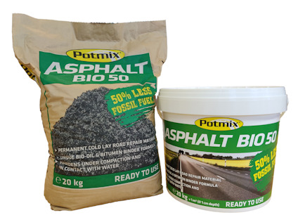 Potmix Asphalt Bio 50 är en väldigt klimatvänlig och högkvalitativ asfalt för hållbara och permanenta reparationer av asfaltsytor. Dess bindemedel är en unik blandning av bitumen och bioolja. Produkten härdar under tryck och i kontakt med fukt. Härdningen kan påskyndas genom bevattning innan komprimering (åtgång: cirka 2 liter vatten per 20 kg material). Trafiken kan släppas på direkt på det reparerade området. Asphalt Bio 50 fungerar lika bra både sommar- och vintertid och är helt fritt från VOC/lösningsmedel. Förvaras torrt.
