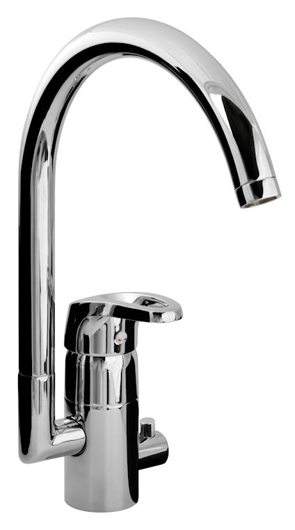 Disklådsblandare med keramisk insats. Levereras med anslutningsslang i mjuk metallomspunnen PEX med 10 mm:s metallände för vanlig kopparrörskoppling eller förminskning. Spärrad pip 120º.