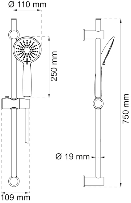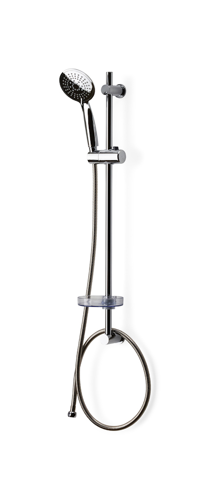 Komplett duschset med handdusch, duschstång och elastisk duschslang. Handduschen har tre stråltyper och Rubber Clean-gummi som gör det enkelt att avlägsna kalk från munstycket. Duschhuvudet har diameter 110 mm. 750 mm duschstång med flexibelt övre väggfäste. Använd gamla skruvhål. Elastisk duschslang i rostfritt stål, 1500-2000 mm. Passar alla blandare och duschar, G1/2. Vattensparfunktion, 6,5 liter / minut. Använd de medföljande svarta packningarna vid installation. Får ej stå under konstant tryck.