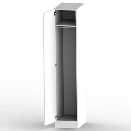 Garderob 40cm med 1 hylla, 1 stång, gångjärn och lucka. Emballage av papp. Minsta orderkvantitet 20st. OBS Nettoprissatt