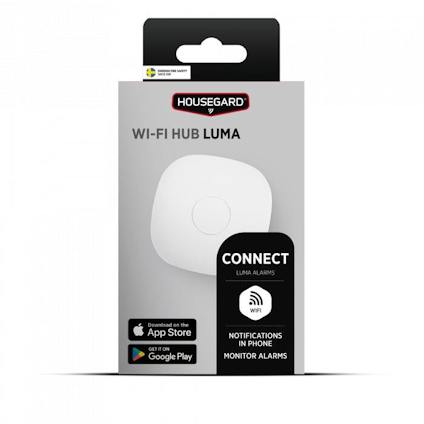 Hubb för brandvarnare Luma Housegard ansluter Luma-produkter till mobiltelefon och aviserar vid eventuella missljud, låg batteriladdning och sabotage.
