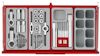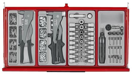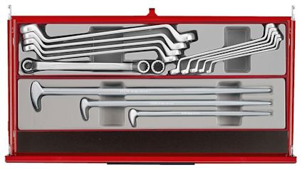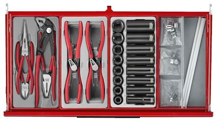 Verktygssats TengTools TKS26R753T består av tre, 26'’ breda enheter staplade på varandra vilka innehåller en verktygssats med 753 delar, med det mesta du behöver vid arbete på bilar och mekaniska arbeten. Konstruktion av högkvalitativt stål och behandlat med fosfatfritt rostskydd (5-stegsbehandling) och pulverlackerad yta. Tåliga länkhjul (5’’) som underlättar transport på verkstaden och kombinationslås med tre siffror på varje enhet. 16 lådor, alla med 3-stegs kullagrade skenor och mattor av EVA-skum. TengTools verktygslösning för organiserad och lättillgänglig verktygsförvaring.