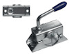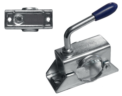 Stödhjulsklämma Valeryd. Stödhjulsklämma till släpvagn, utförande Ø48 mm. Klämman är avsedd för stödhjul med 48 mm diameter. Vikbar vev. Tillverkad i plåt. Avstånd mellan hålen för infästning: 105 mm (centrum till centrum). Skruvas fast med M10 bult (köps separat).Stödhjulsklämman passar till alla vanliga släpvagnar för personbilar.