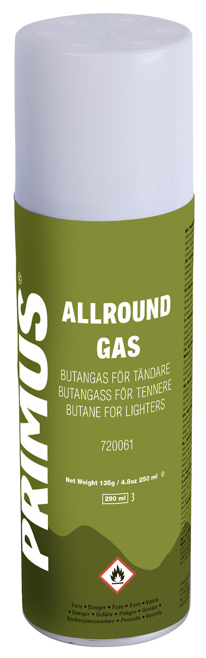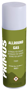 Allroundgas Primus 720062 Butangas för återfyllning av bl.a. gasdrivna lödpennor, Sieverts gasbrännare, cigarrettändare, braständare etc. 6 st. munstycken i plast ingår. Gasbehållaren innehåller isobutan. Brandfarlig gas.