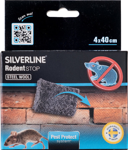 Tätning för springor/öppningar där möss/råttor kan ta sig igenom. Tillverkad av rostfri tråd i olika längd/diameter samt PE-fiber för bästa motståndskraft mot gnagare. Klipps i lagom bitar och trycks in i springan/öppningen. Använd handskar. Läs mer