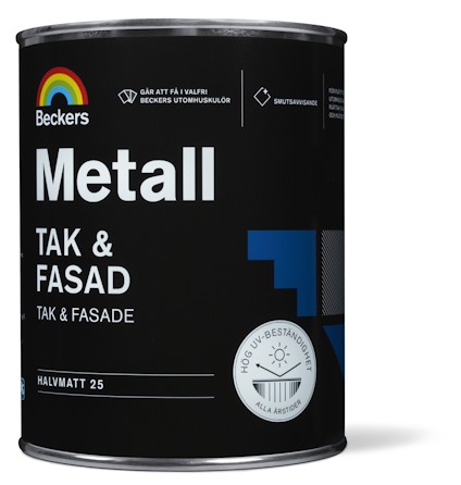 Beckers Metall Tak & Fasad är en halvmatt täckfärg som används på de flesta typer av plåttak, plåtfasad och plåtdetaljer. Avsedd för tidigare målade eller grundmålade ytor. Färgen är smutsavvisande och har mycket hög UV-beständighet som ger ett långt och hållbart resultat. Metall Tak & Fasad går att få i valfri Beckers utomhuskulör.